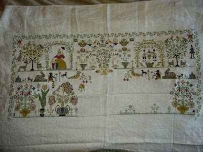 I always look at the 'before and after' of the rotation on this project and think, "Ten hours and that's ALL I got done? I must be the world's slowest stitcher!!!" I need to remember that each page is the equivalent of a small spot sampler. Getting one of those done every couple of months isn't a bad pace.